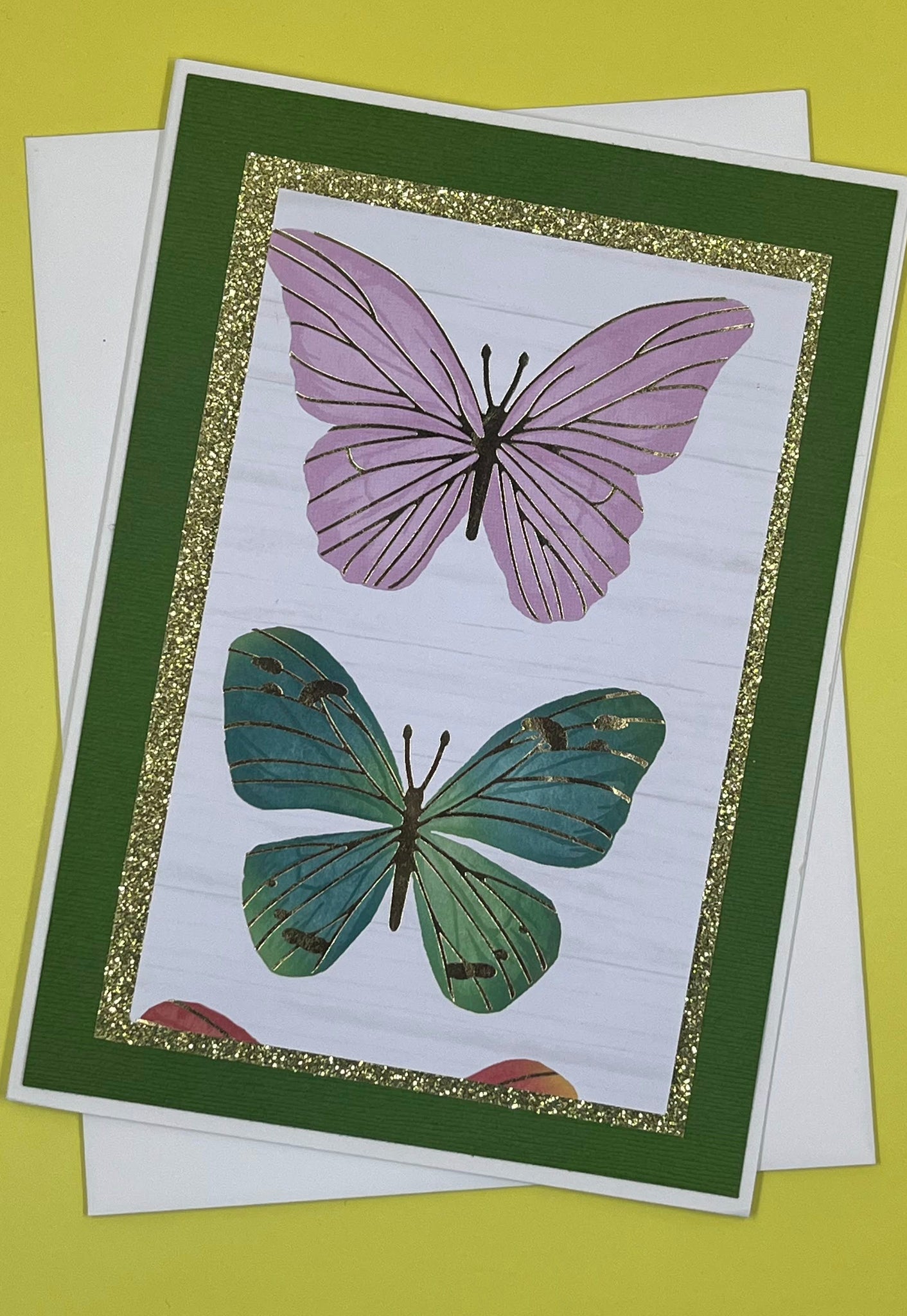 5 in. X 7 in. greeting cards. Blank inside. Envelope included. Additional postage may be required. Because each card is handcrafted, variations in butterfly color and positioning my vary.